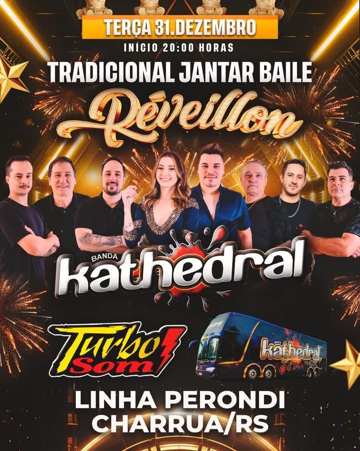 Alô charrua e toda região Vem ai o tradicional jantar baile de réveillon As 20 horas jantar Em seguida baile com eles Ao vivo BANDA KATHEDRAL E pra agita a galera TURBO SOM #viralizar #destacar